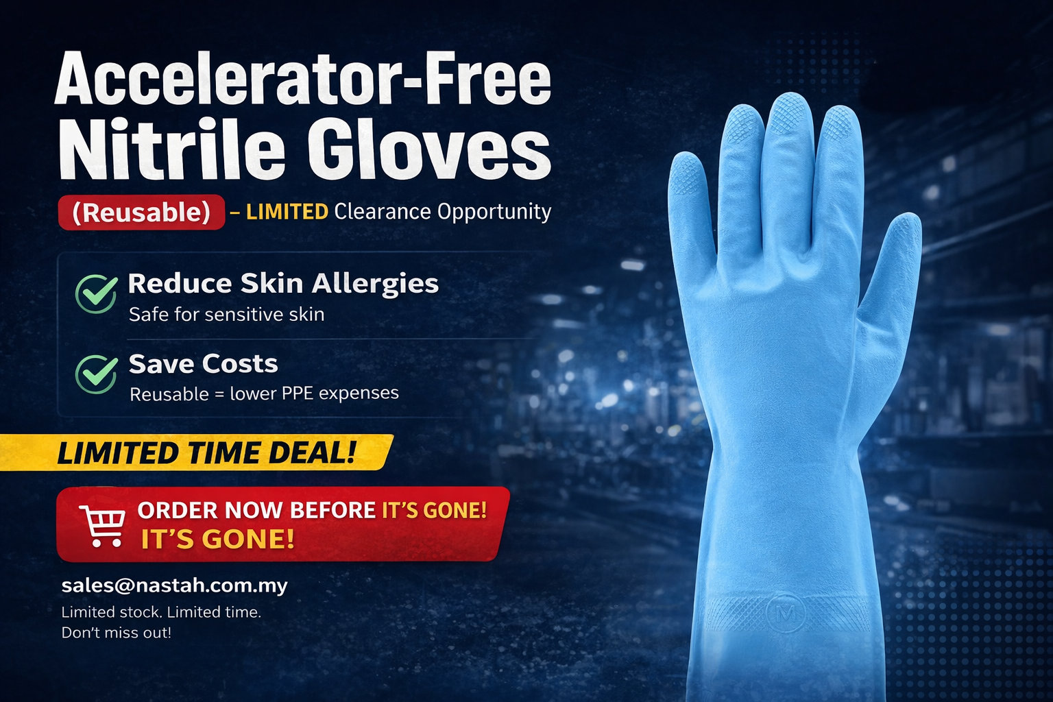 And now — for a limited time — Nastah is offering our reusable accelerator-free nitrile gloves at special clearance pricing.